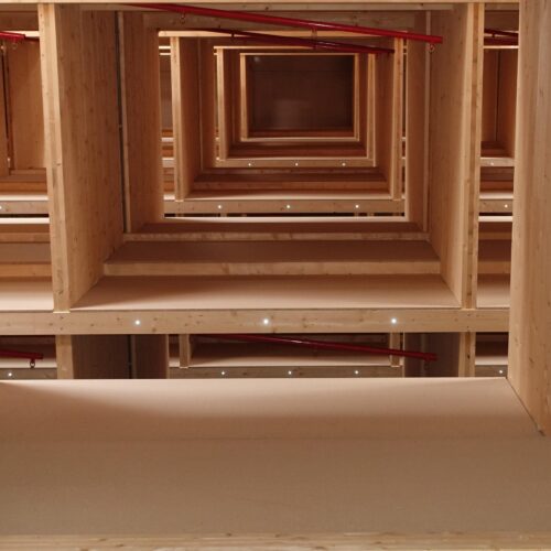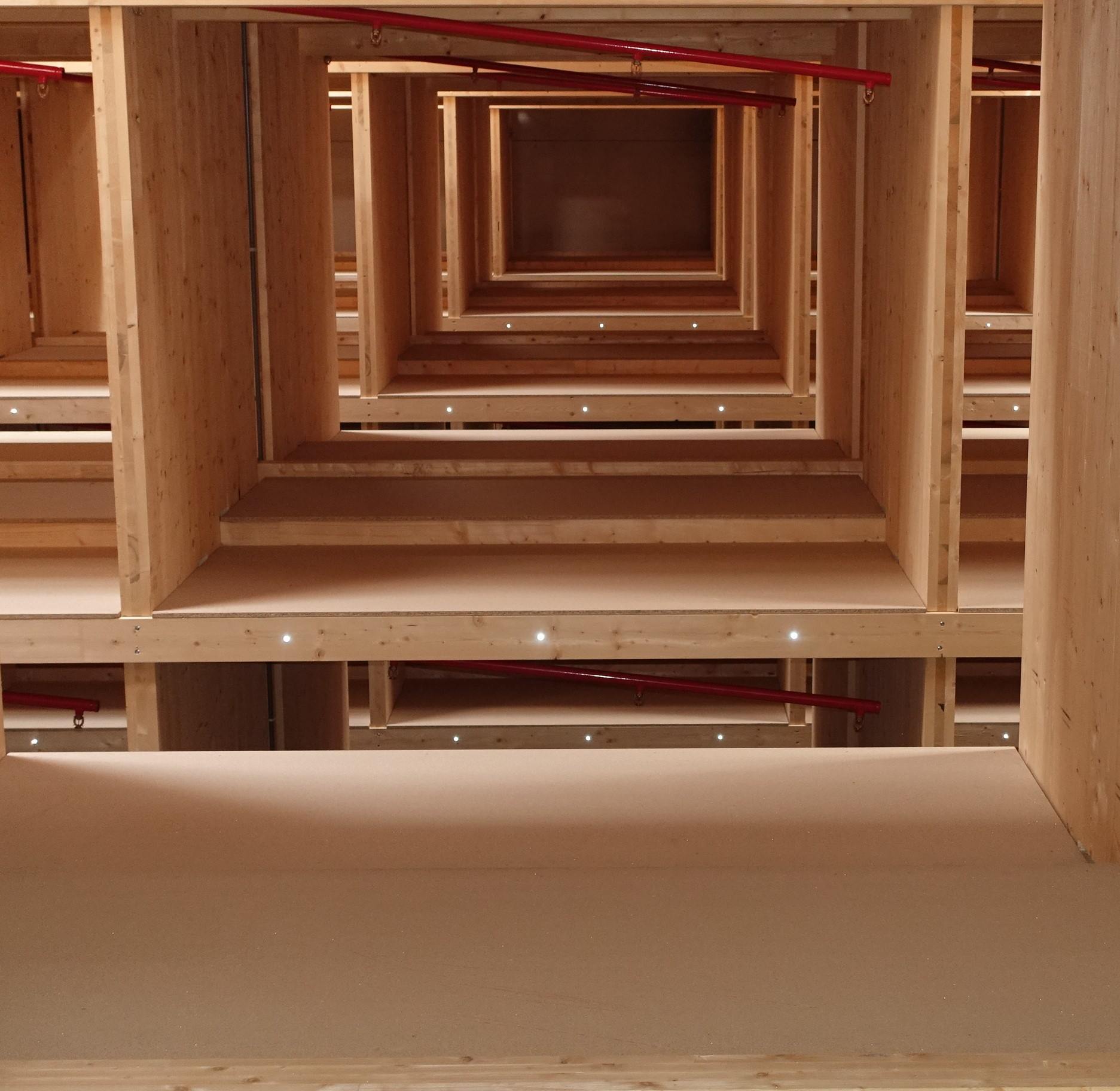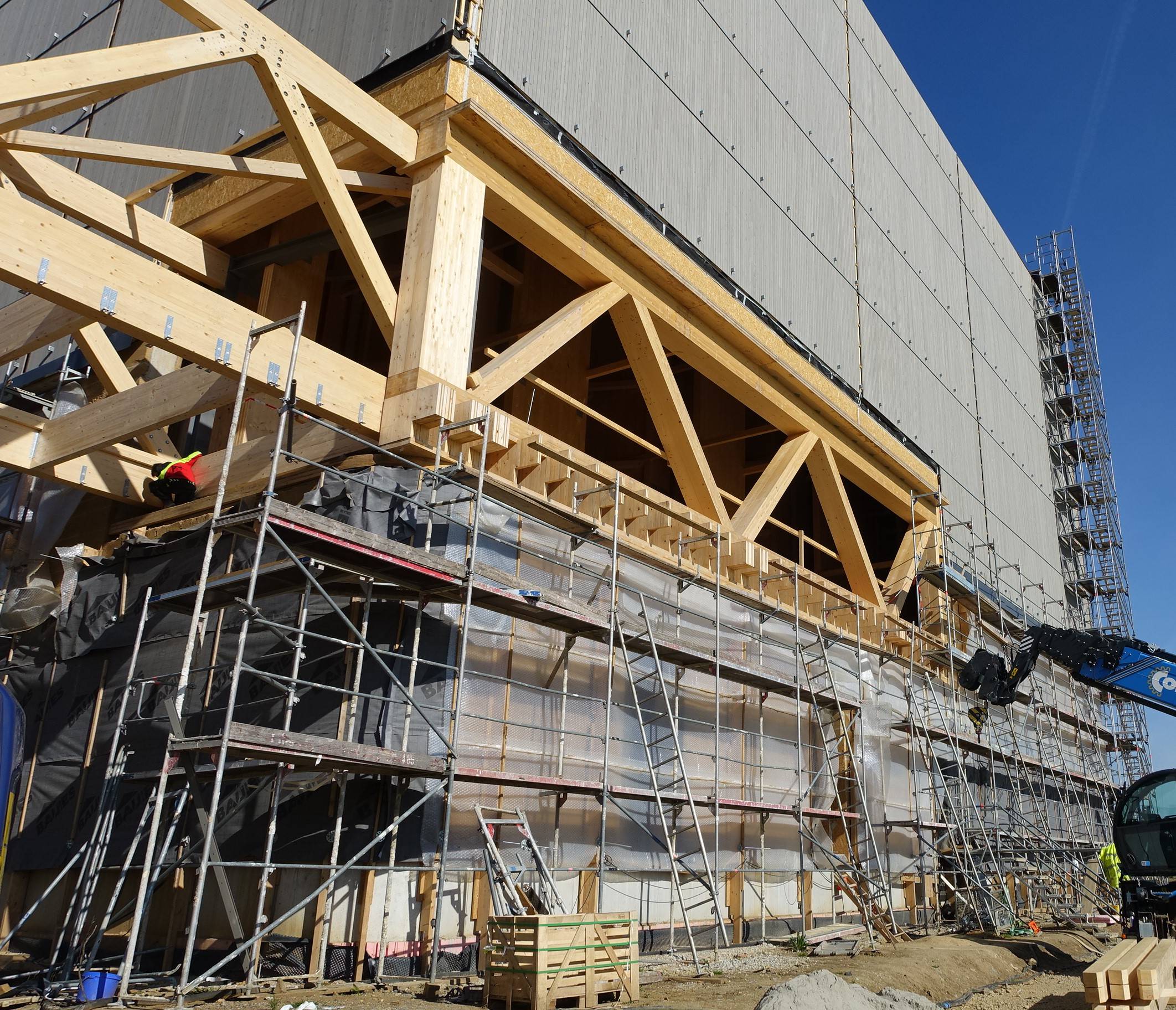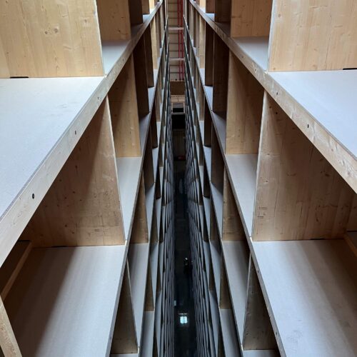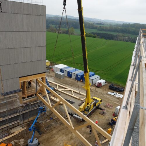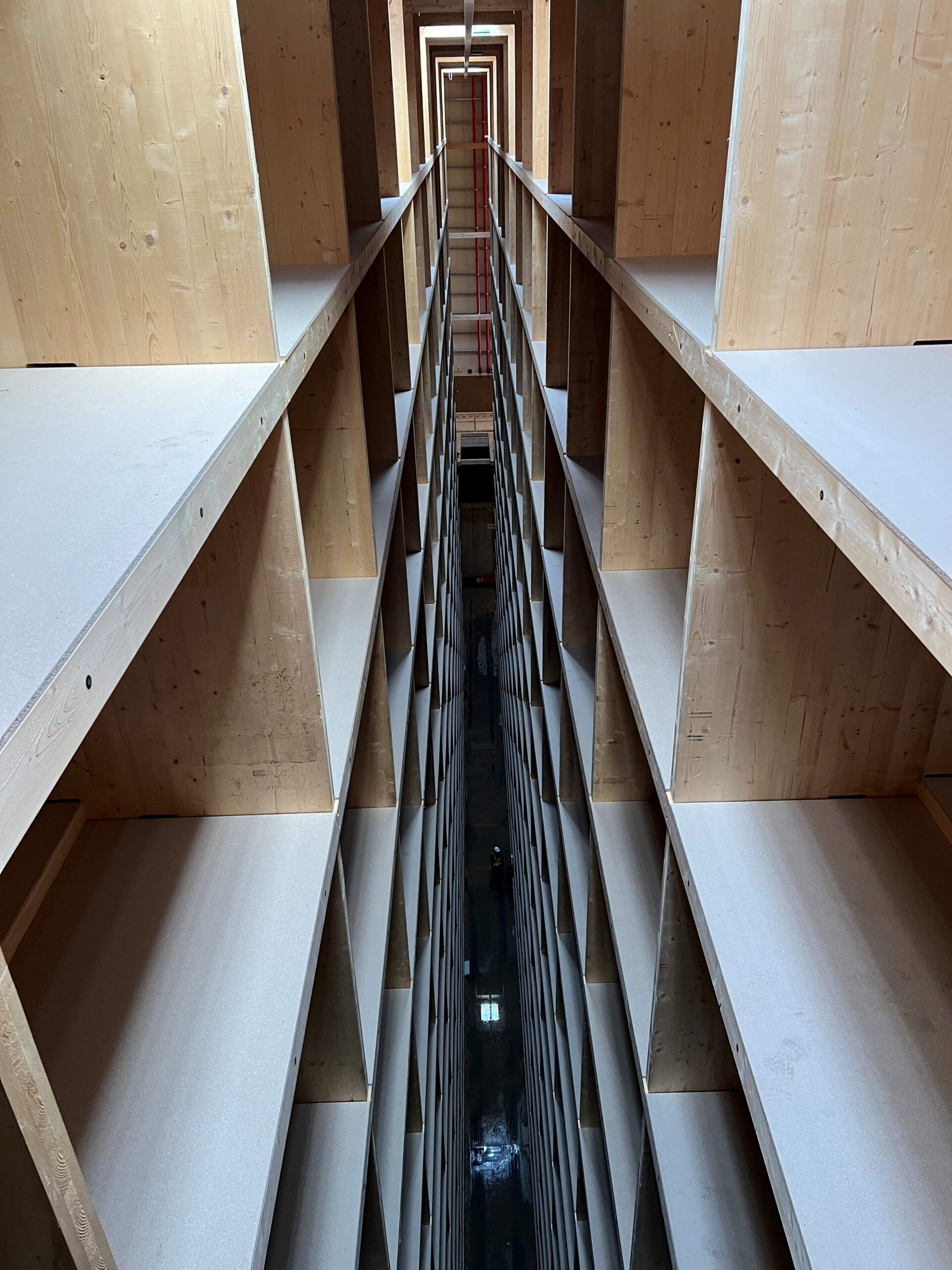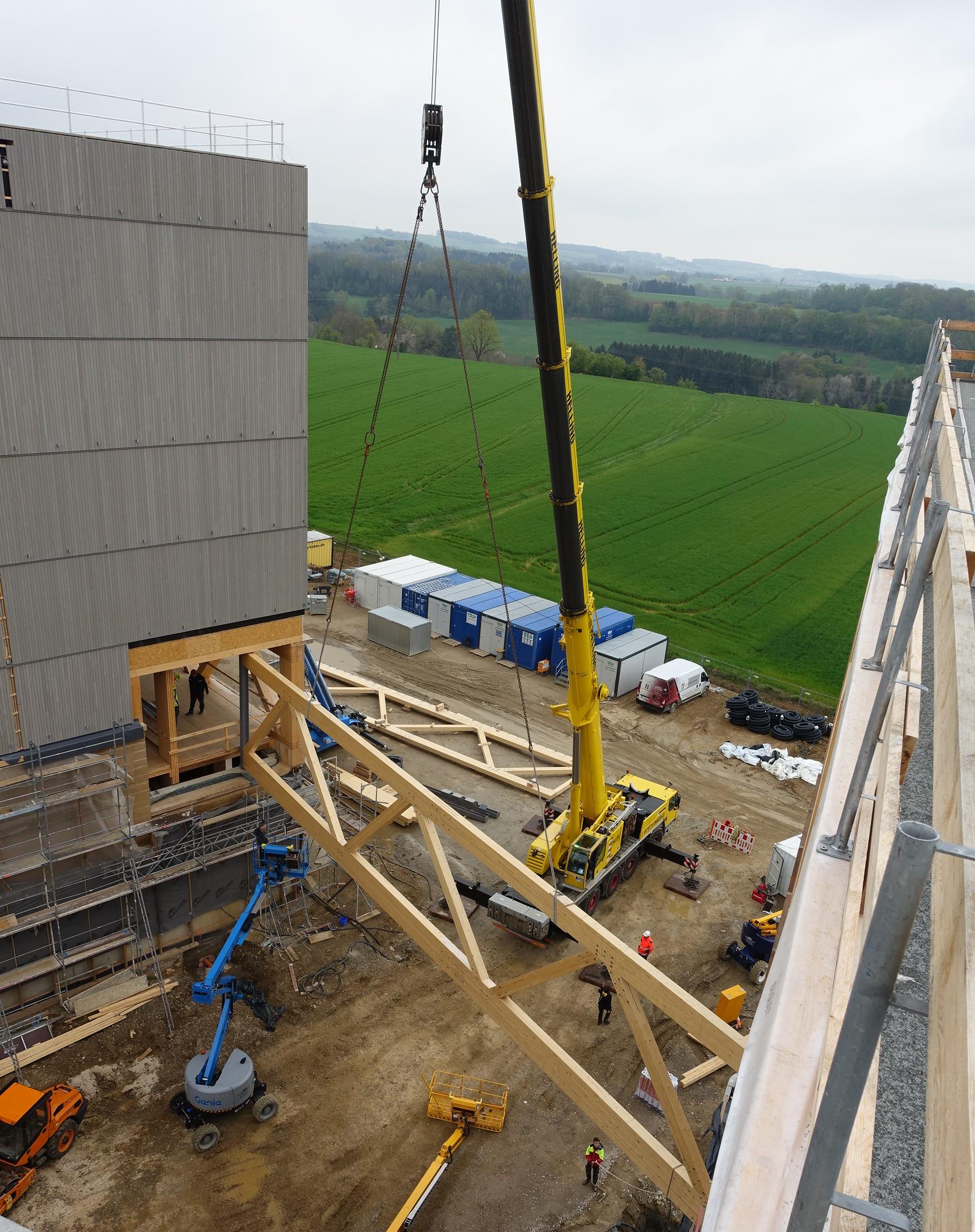 Mit einer beeindruckenden Gesamthöhe von rund 30 Metern und Platz für über 17.000 Paletten bildet das vollautomatische Hochregallager das Herzstück des Campus. Die Tragkonstruktion aus Brettschichtholz und Brettsperrholz trägt Dach und Fassade und steht damit sinnbildlich für das Leitmotiv „Technik trifft Nachhaltigkeit“.