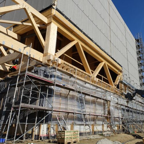Auf einer Grundfläche von rund 81 × 41 Metern dient das Gebäude der Verteilung und Lagerung von Waren. Die unteren Ebenen bestehen aus vorgefertigten Stahlbetonelementen, während die oberen Geschosse in leichter Holzbauweise ausgeführt wurden – ein intelligentes Zusammenspiel von Robustheit und Leichtigkeit, das die Effizienz im laufenden Betrieb unterstützt.